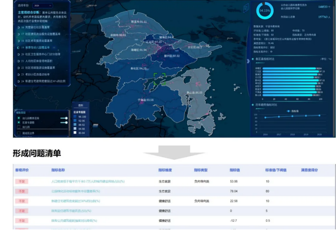 寧波作為全國(guó)城市體檢樣本城市,創(chuàng)新體檢工作方法,推動(dòng)體檢成果應(yīng)用成為體檢工作的關(guān)鍵?,F(xiàn)階段寧波已建立起“內(nèi)容構(gòu)建-數(shù)據(jù)采集-計(jì)算評(píng)價(jià)-診斷建議-行動(dòng)落實(shí)”的智慧評(píng)估體系,以“體征采集—體征分析—問題診斷—場(chǎng)景應(yīng)用”為評(píng)估信息平臺(tái)建設(shè)的主脈絡(luò),構(gòu)建“1+3+X”的功能框架,逐步形成了以“診斷分析、監(jiān)測(cè)預(yù)警、輔助決策”為核心的智慧評(píng)估閉環(huán)。評(píng)估平臺(tái)以客觀指標(biāo)為基礎(chǔ)、居民問卷調(diào)查為補(bǔ)充,精準(zhǔn)查找居住環(huán)境、社區(qū)服務(wù)存在的問題,匯集而成社區(qū)養(yǎng)老服務(wù)設(shè)施覆蓋率、社區(qū)衛(wèi)生設(shè)施覆蓋率、社區(qū)低碳能源設(shè)施覆蓋率、公交站覆蓋社區(qū)占比、人均避難場(chǎng)所有效避難面積等16類成果數(shù)據(jù)和分析結(jié)果,綜合反應(yīng)城市發(fā)展、人居環(huán)境的短板,為民政、衛(wèi)健、交通、應(yīng)急等多部門分類提供城市體檢中所遇到的具體問題、核心內(nèi)容并制定相應(yīng)解決措施,從而加快城市體檢成果。