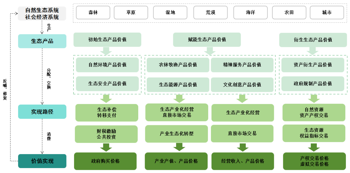 生態(tài)產(chǎn)品價(jià)值實(shí)現(xiàn)的形成機(jī)理,是以生態(tài)系統(tǒng)的可持續(xù)供給為基礎(chǔ),通過差異化路徑形成不同類型的價(jià)值形態(tài),并借助多元機(jī)制貫穿于生產(chǎn)、交換、分配、消費(fèi)的社會(huì)經(jīng)濟(jì)循環(huán)全過程。最終目標(biāo)是實(shí)現(xiàn)生態(tài)保護(hù)者受益、使用者付費(fèi)、破壞者賠償,促進(jìn)生態(tài)效益、經(jīng)濟(jì)效益、社會(huì)效益的協(xié)調(diào)統(tǒng)一。