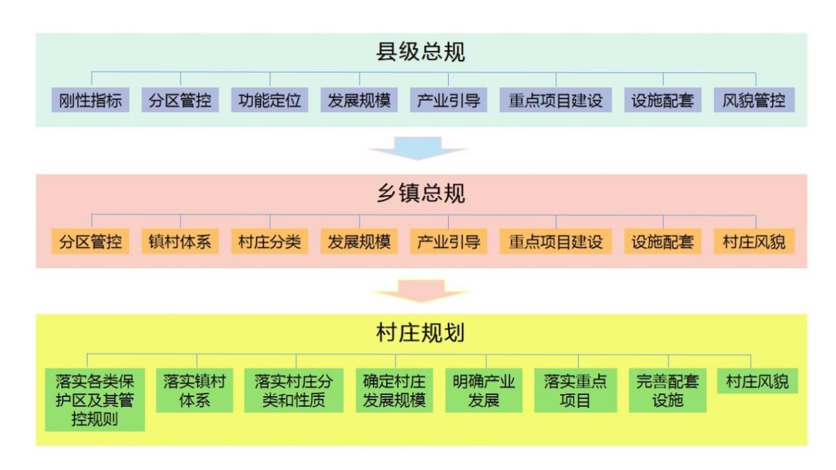 縣級(jí)國(guó)土空間總體規(guī)劃在剛性指標(biāo)、分區(qū)管控、功能定位、發(fā)展規(guī)模、產(chǎn)業(yè)引導(dǎo)、設(shè)施配套、重點(diǎn)項(xiàng)目建設(shè)、風(fēng)貌管控等方面對(duì)鄉(xiāng)鎮(zhèn)、村莊規(guī)劃進(jìn)行傳導(dǎo)。