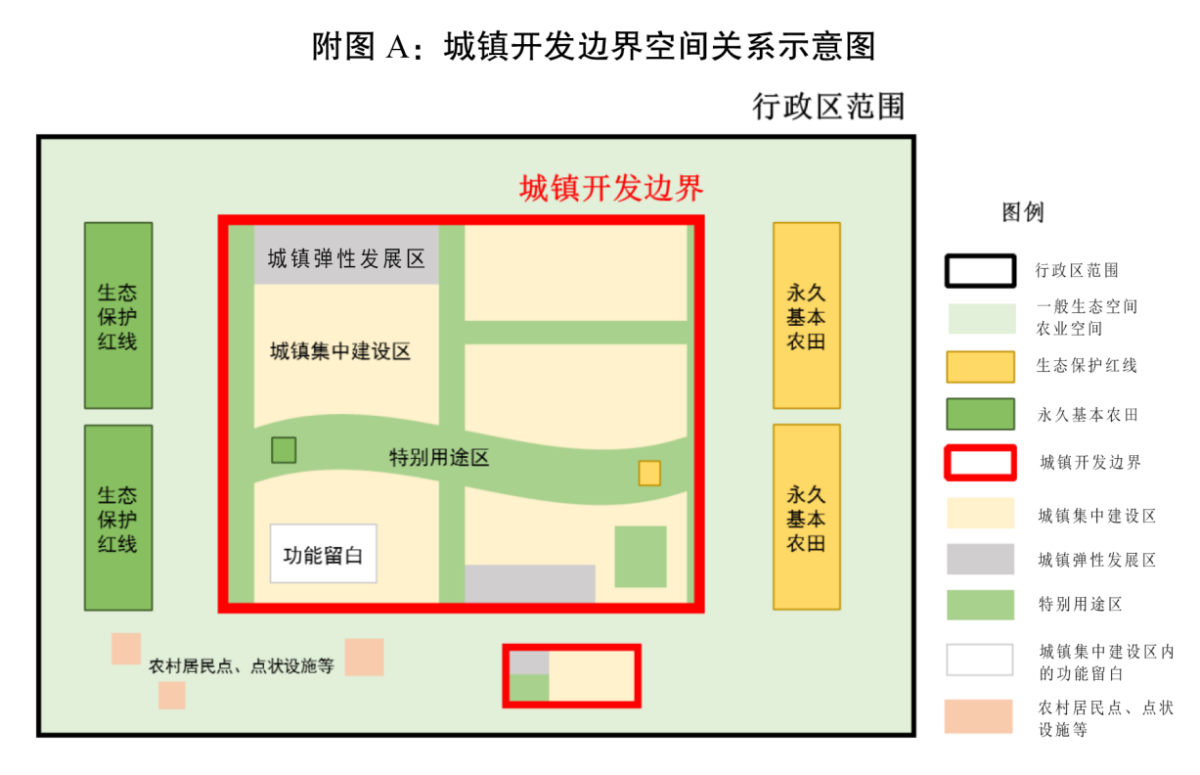 城鎮(zhèn)開發(fā)邊界是在國土空間規(guī)劃中劃定的,一定時期內(nèi)因城鎮(zhèn)發(fā)展需要,可以集中進行城鎮(zhèn)開發(fā)建設(shè),完善城鎮(zhèn)功能、提升空間品質(zhì)的區(qū)域邊界,涉及城市、建制鎮(zhèn)以及各類開發(fā)區(qū)等。城鎮(zhèn)開發(fā)邊界內(nèi)可分為城鎮(zhèn)集中建設(shè)區(qū)、城鎮(zhèn)彈性發(fā)展區(qū)和特別用途區(qū)(空間關(guān)系詳見圖A)。城市、建制鎮(zhèn)應(yīng)劃定城鎮(zhèn)開發(fā)邊界。