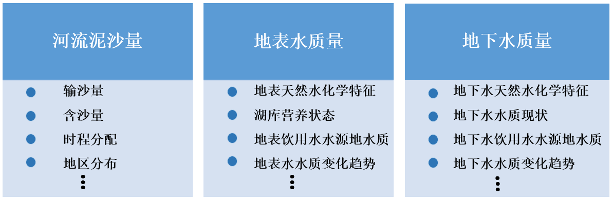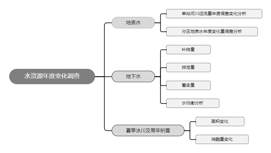 對水資源主要指標(biāo)開展年度變化調(diào)查評價,包括湖泊、水庫和重點(diǎn)江河水體儲存年度變化量,地下水儲存年度變化量,冰川及常年積雪年度面積變化和消融量,河湖庫塘水面面積年度變化等,具體指標(biāo)如下圖所示。