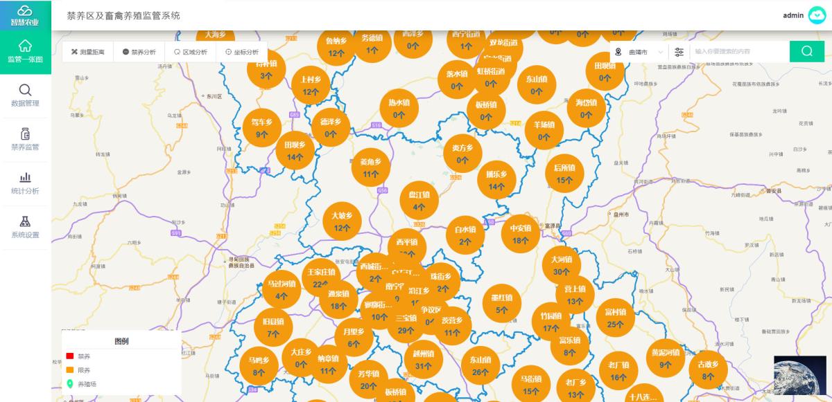 配合開展養(yǎng)殖污染綜合治理、保護(hù)和改善生態(tài)環(huán)境工作,整合禁限養(yǎng)區(qū)與養(yǎng)殖企業(yè)信息至禁限養(yǎng)區(qū)+養(yǎng)殖監(jiān)管平臺,通過一張圖展示、大數(shù)據(jù)分析、監(jiān)督執(zhí)法工作管理、專題數(shù)據(jù)挖掘等技術(shù),幫助監(jiān)管部門優(yōu)化養(yǎng)殖企業(yè)結(jié)構(gòu)和布局,加強(qiáng)重點(diǎn)區(qū)域、重點(diǎn)流域的環(huán)境保護(hù)。